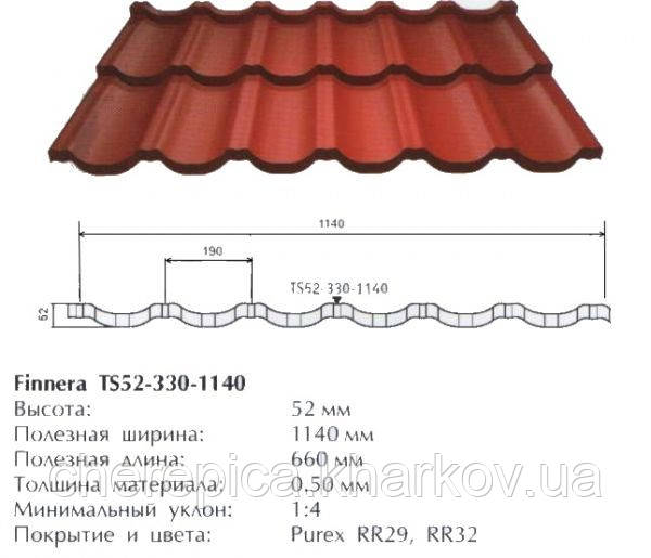 Металочерепиця Finneraтм (Фіннера) випускається у Фінляндії з полімерним покриттям Crown BTтм – це інноваційне покриття, розроблене Ruukki спеціально для покрівельних листів. Finneraтмпоставляється з гарантією строком 40 років на технічні та 15 років на естетичні характеристики.