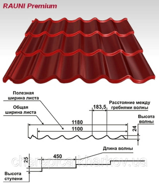 Має збільшену порівняно із звичайною металочерепицею довжину хвилі і висоту сходинки. Завдяки цим параметрам черепиця RAUNI Premium володіє яскравою архітектурною виразністю, вона ідеально підходить для високих дахів, покрівель з великою площею. Збільшені параметри довжини хвилі і висоти ступені роблять покрівлю изRAUNI Premium індивідуальної, така покрівля ефектно виділяється на тлі інших.