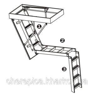 З'єднання тятиви бічних елементів і сходинок сходів кріплення «ластівчин хвіст» гарантує надійність і міцність конструкції. Ступені не стикаються з кришкою сходи, а протиковзкі виїмки забезпечують комфорт і безпеку використання. Кутові петлі-шарніри і спеціальний трафарет, що поставляються в комплекті з кріпильним елементом, дозволяють точно відрегулювати висоту сходів до потрібного розміру.